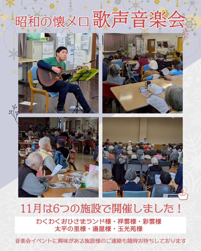 🎶11月の歌声音楽会レポート🌈 11月は、6つの施設さま にて昭和の懐メロ歌声音楽会…
